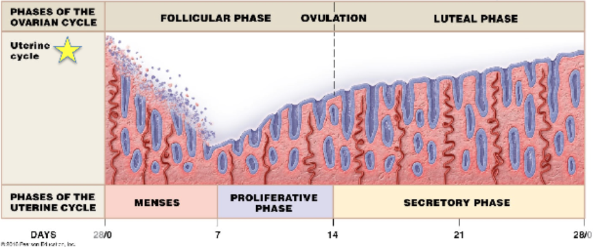 -proliferative phase: latter part of the follicular phase, the uterus adds new cells to the endometrium later in anticipation of pregnancy