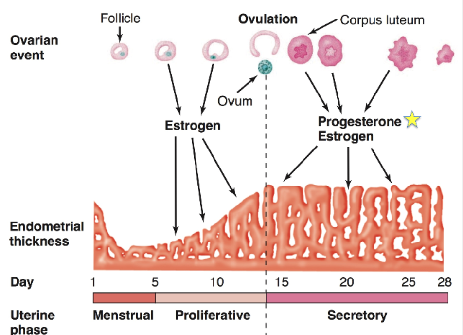-secretory phase: after ovulation hormones from corpus luteum covert thickened endometrium into a secretory structure