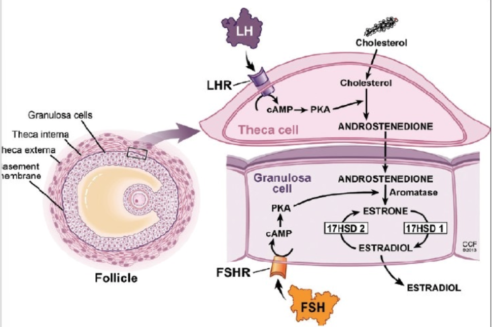 -androgens (androstenedione) converted to estrogens (aromatase) in granulosa cells