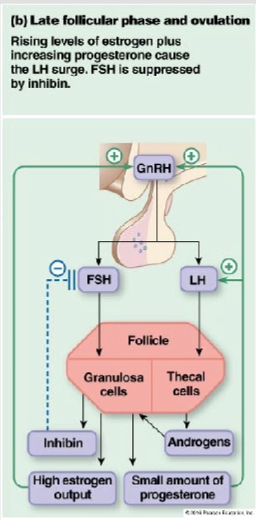 -some follicles undergo atresia, dominant follicle persists and granulosa cells now begin to also release progesterone and inhibin