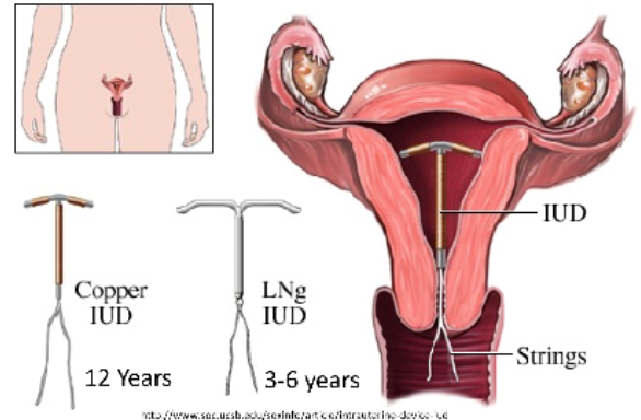 IUD: plastic devices (some wrapped in copper) that create a mild inflammatory reaction in the endometrium that prevents the implantation of a fertilized egg as well as kill sperm
