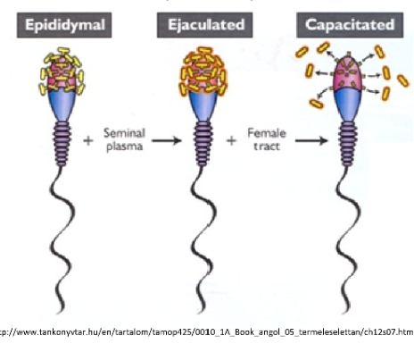 -sperm shed surface molecules (proteins and carbohydrates) allowing them to rapidly swim and penetrate an egg, believed to depend on substances produced in uterus (albumin, lipoproteins, proteolytic enzymes)