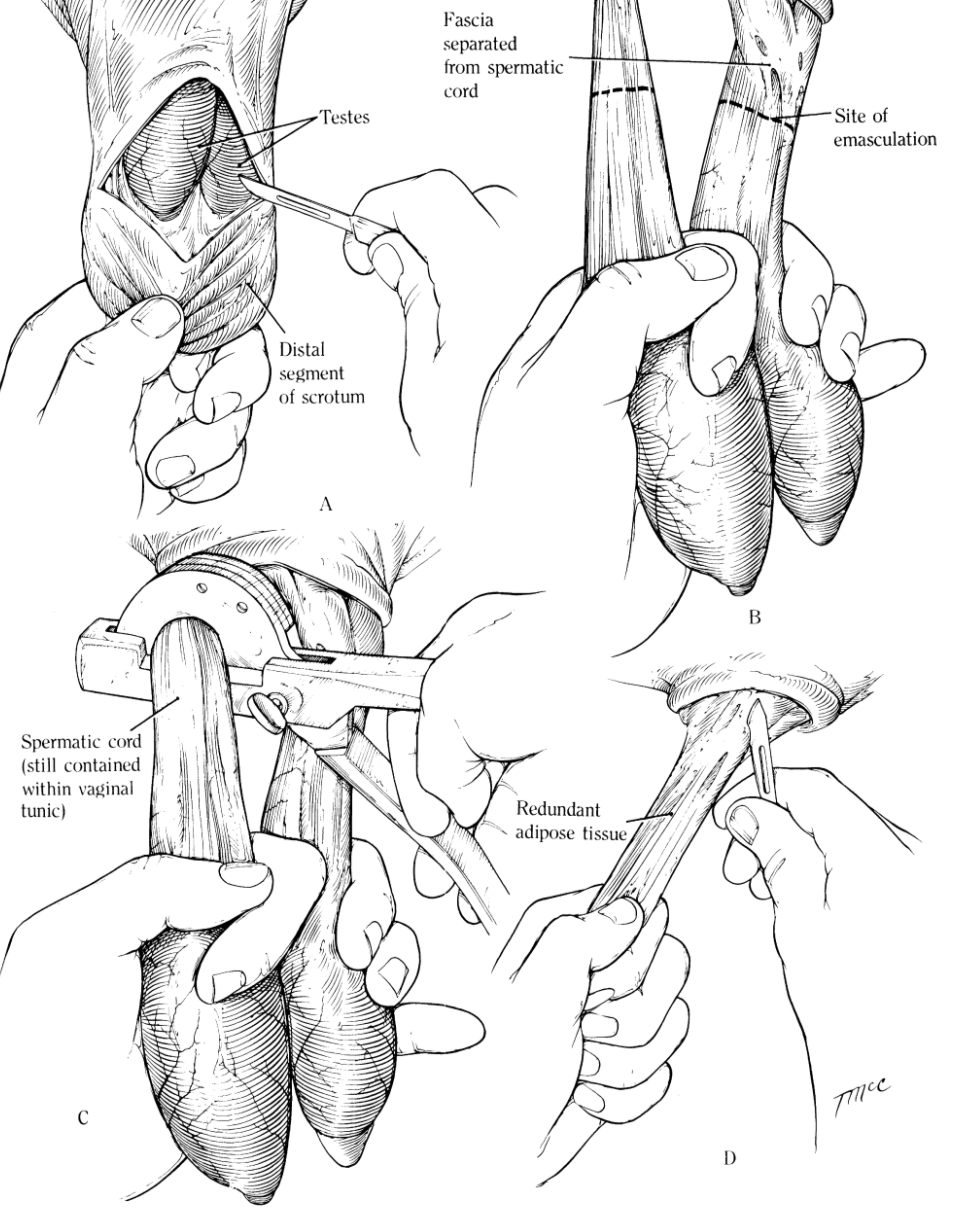 Technique for std castration of calves (ideally approx 4 weeks)