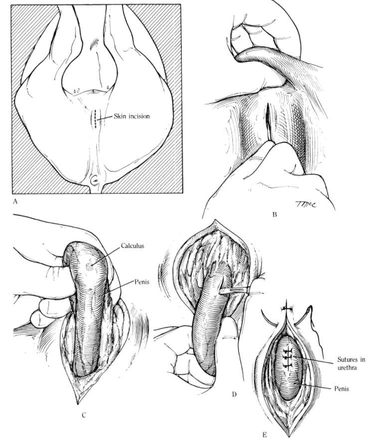 Urethrostomy most commonly used to allow recovery to permit reaching slaughter weight. Not a good long term solution as commonly stricture & obv can’t breed if entire bulls as urethra not continuous