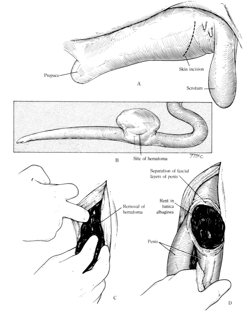 Penile hematomas usually result from a rupture of tunica albuginea on the dorsal aspect of the distal bend of the sigmoid flexure, opposite insertion of retractor penis mm.