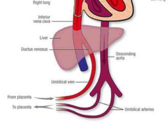 Deoxygenated blood (so opposite of what you would normally think about arteries) from fetal internal iliac arteries (off of fetal descending aorta) –> placenta