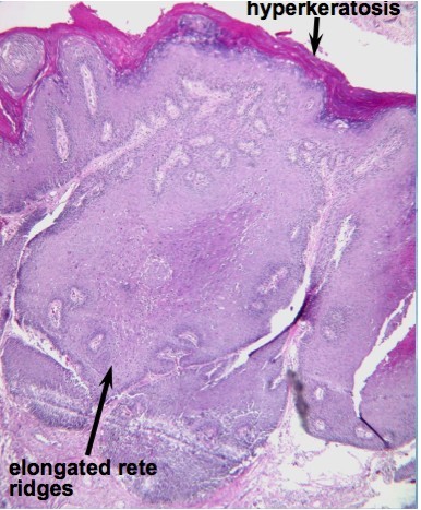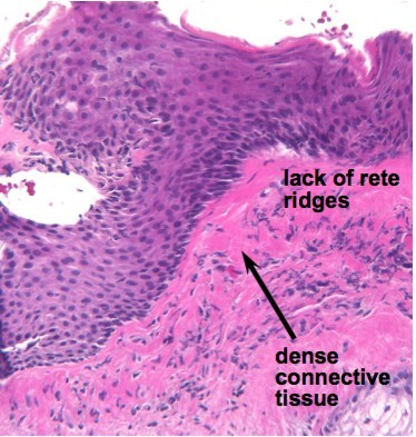 Histology: hyperkeratosis of vulvar skin, loss of rete ridges, devleopment of acellular homogenous zone of superficial dermis