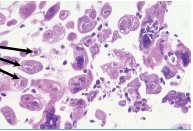 A woman comes to your office for her annual pap smear and you notice a large red lesion on her cervix. Your patient reports she has had unprotected sex in the last two months. When you ask the patient if she has had any discomfort during sex, she denies any discomfort in the urogenital region. You take a sample of the lesion and find the following: