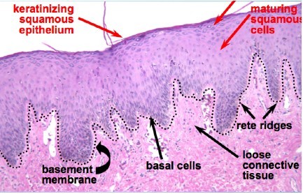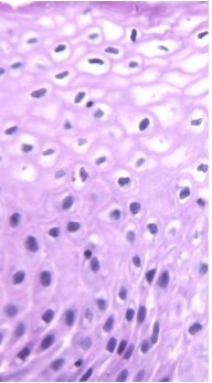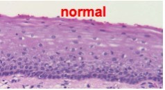 Koilocytes from HPV infection: HPV has invaded basal cells. Crinkled, irregular nuclei with “normal maturation” of cells. Contrasting from normal: