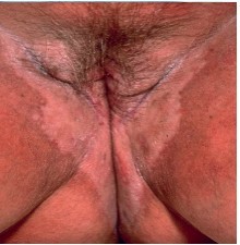 Lichen sclerosis: inflammatory disorder of vulva, seen mostly in post-menopausal women. Associated with autoimmune disorders (vitiligo, pernicious anemia, thyroiditis). See whitish plaques, atrophy, parchment-like skin.