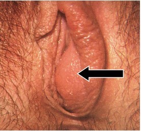 Bartholin gland cyst: Bartholin glands produce mucoid secretions to lubricate vestibule. May become obstructed, secondarily infected with STD (chlamydia, e. coli, staph) and form abcess.