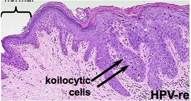 Low grade CIN= episomal virus replicates and accumulates in cytoplasm–> koilocyte; causes cell death
