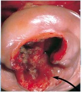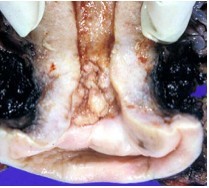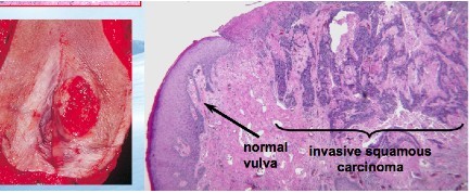 Vulvar squamous cell carcinoma: tumors exophytic or ulcertive (can invade neighboring structures- vagina, rectum). Can spread to inguinal, femoral, pelvic lymph nodes.