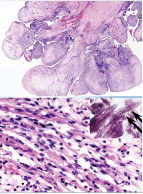 Tumor= polypoid, derived from mesenchymal cells; spindle cells containing cross-striations (histology) indicating skeletal muscle origin