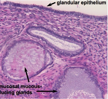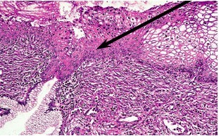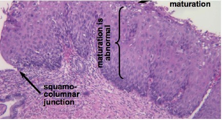 A young woman is in your office for a pap smear. Upon examining the cervix, you note that it is hyperemic and has points of focal erosion. On histologic specimen, this is what you see:
