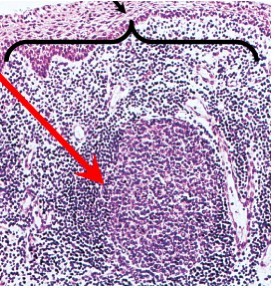 Chronic cervicitis: chronic exposure to bacteria in the vagina (STDs). Mucosa hyperemic, focal erosion visible, lymphocytes and plasma cells with germinal centers, squamous metaplasia.