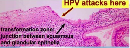 This is where HPV infections can penetrate into the cervix (no squamous epithelium blocking passage into basal cells where HPV infections live