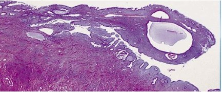Endocervical polyps= benign, arising within endocervix; can cause vaginal bleeding or discharge. Polyps lined with mucinous columnar epithelium with foci of squamous metaplasia, mucosal erosion