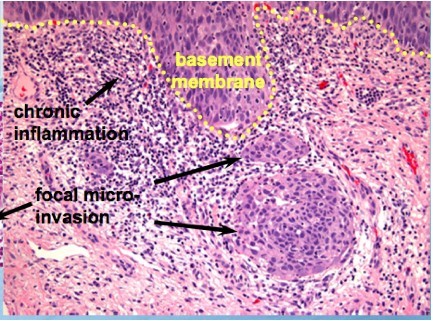Microinvasive carcinoma: small nests of cells just barely penetrating epithelial basement membrane. Can invade vessels or metastasize to lymph nodes.