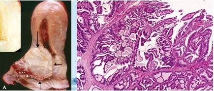 Adenocarcinoma: typically arives from the transition zone and extend into endocervical canal. High grade CIN is present in ~40% of cases.