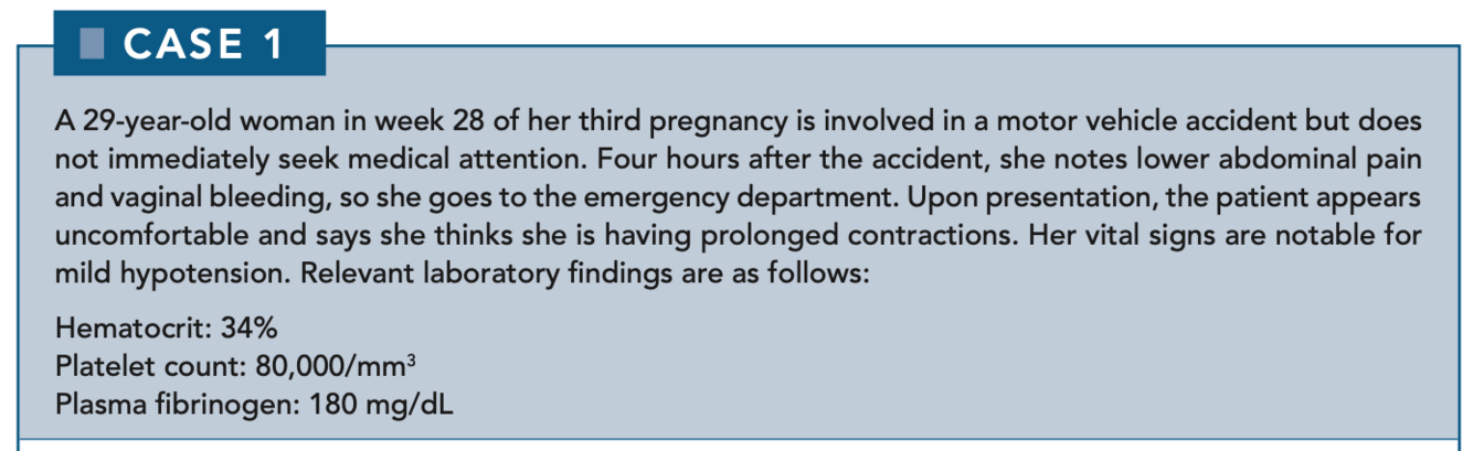 Disseminated intravascular coagulation (DIC) occurs in approximately 10%–20% of cases of serious abruption with fetal death. In these cases, it is thought that the death of the fetus releases procoagulants into the mother’s circulation, triggering DIC. This initiates intravascular activation of coagulation and results in consumption of platelets and clotting factors. Fibrin may deposit in the microcirculation, causing ischemic organ damage and hemolytic anemia and then fibrinolysis of the fibrin deposition. Ultimately, this can cause a bleeding diathesis along with clinical manifestations of thrombosis.