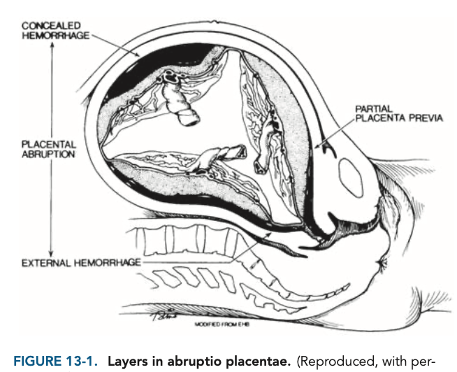 Abruptio placentae is the premature separation of a normal placenta from the uterus occurring after 20 weeks’ gestation and before delivery. The rupture of maternal blood vessels at the anchoring villi of the placenta causes a separation from the endometrium in which blood can accumulate. The hemorrhage can be external or concealed (Figure 13-1). This in turn disrupts the fetal blood supply and in severe cases can lead to fetal death.