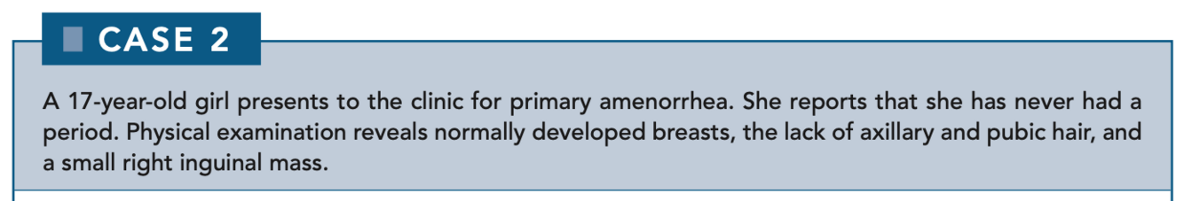 Androgen insensitivity syndrome (also known as testicular feminization syndrome) should be suspected in a woman with primary amenorrhea, little or no axillary/pubic hair, and an inguinal mass. The disease affects approximately 1:100,000 chromosomal males.