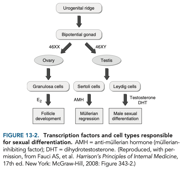 This disorder results from dysfunction of the androgen receptors in a genetically male patient. The testes are present and secrete testosterone and müllerian inhibiting factor (MIF). However, the person cannot respond to this testosterone because the peripheral receptors are nonfunctional. Instead, the testosterone is converted into estradiol in peripheral tissues (especially adipose tissue), which initiates breast development. The vagina is often present but may be short and blind-ending. The MIF secretion inhibits normal development of the ovaries and uterus. Figure 13-2 illustrates genetic regulation of gonadal development.