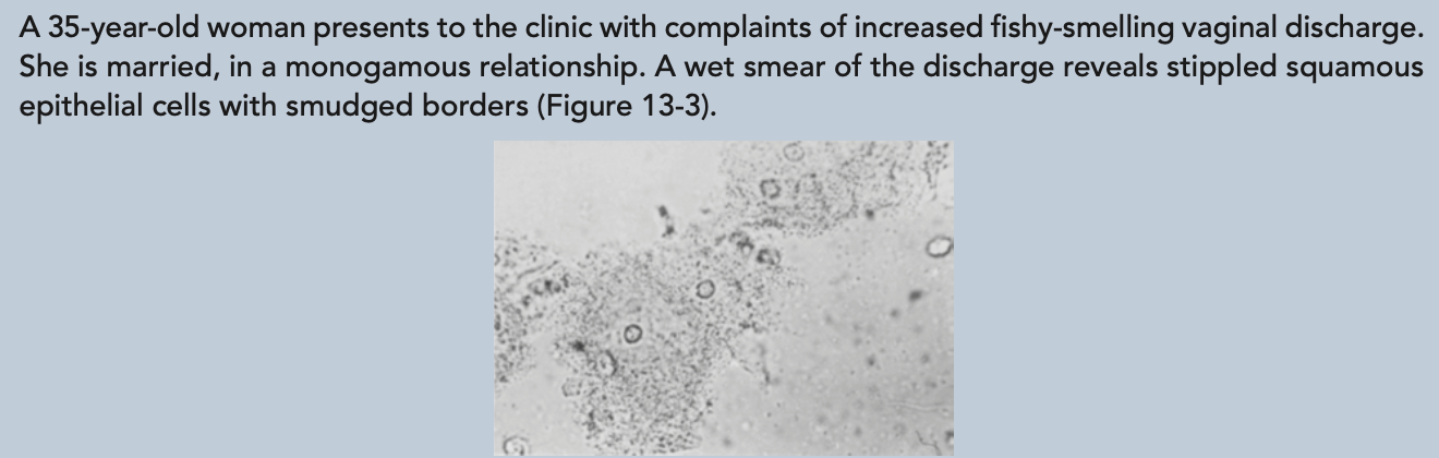 As this woman is in a monogamous relationship she is not at high risk for STIs such as Trichomonas, Neisseria gonorrhoeae, or Chlamydia. Most women with chlamydia and gonorrhea are asymptomatic, although they can have cervical motion tenderness on pelvic exam. Trichomonas often causes a frothy discharge. Candida is another common cause of vaginitis, which is not sexually transmitted. Women with candida often present with vaginal itching and increased white, curdlike discharge.
