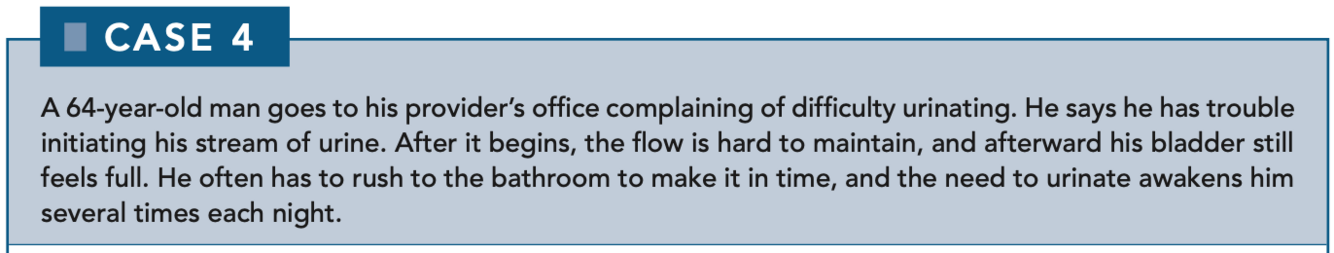 Medical options include cholinergics (eg, bethanechol), α-blockers (eg, prazosin), and 5α-reductase inhibitors (eg, finasteride). Cholinergics help increase bladder contractility, whereas α-blockers relax the bladder neck so that urine flows more easily. The 5α-reductase inhibitors prevent the formation of DHT so that prostate growth is retarded. Side effects of finasteride include sexual dysfunction and postural hypotension. Surgery is also an option.