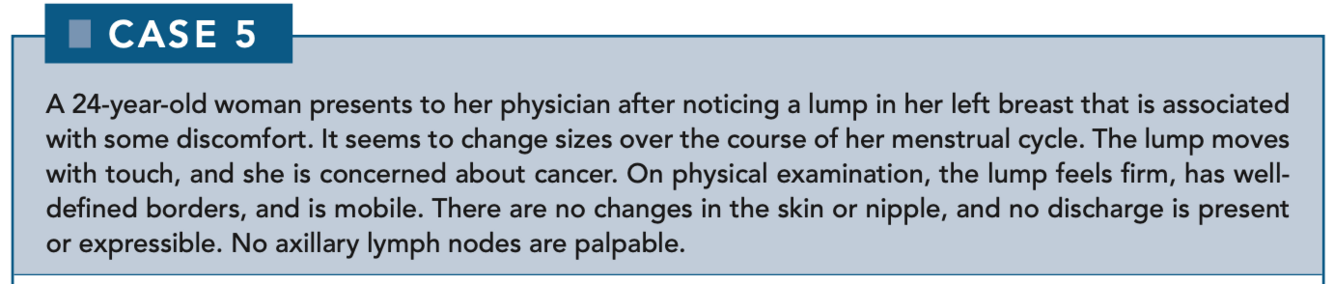 Approximately 90% of breast lumps discovered in women between 20 and 50 years of age are benign. Fibroadenomas are the most common breast tumors seen in young women. They are benign, often arise quickly, and reabsorb within several weeks to months. Fibroadenomas do not carry an increased risk of breast cancer. Approximately 20% of fibroadenomas are bilateral or multiple. The risk associated with having a first-degree relative with breast cancer is higher the younger the relative is at diagnosis.