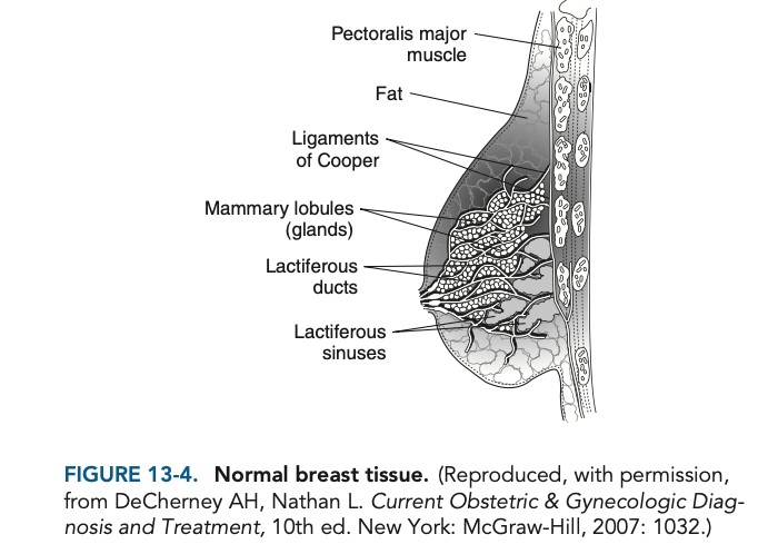Breast tissue is found between the second and sixth ribs and is made of parenchyma and stroma (Figure 13-4). The parenchyma has 15–25 lobes, each of which has 20–40 lobules composed of alveoli. Lactiferous ducts offer drainage to the corresponding lobe. The ducts are dilated immediately before the nipple, forming the lactiferous sinuses.