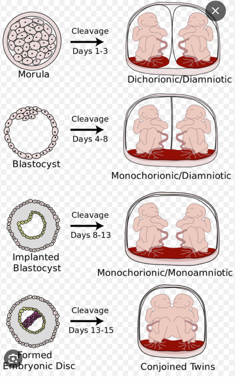 Note: Prognosis gets worse the later the split occurs (e.g. monoamniotic twins can get tangled together).