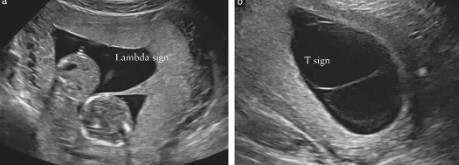 Note: Arrow points to the intertwin membrane (T sign without twin peak sign).