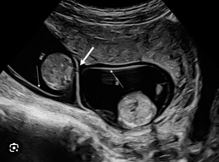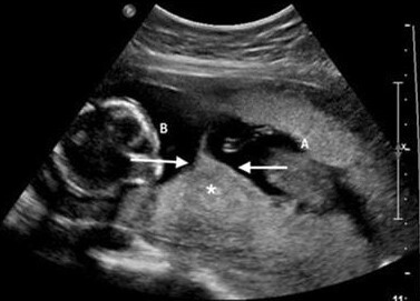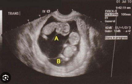Note: Twin A has polyhrdramnios and twin B has oligohydramnios (AKA TOPS/Twin Oligohydramnios Polyhydramnios Sequence).