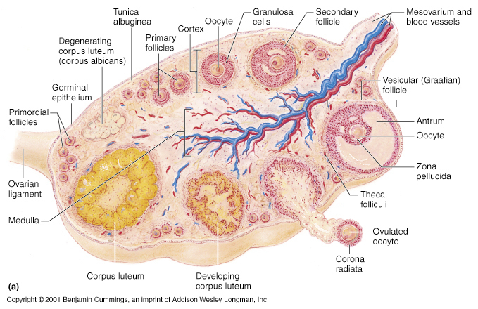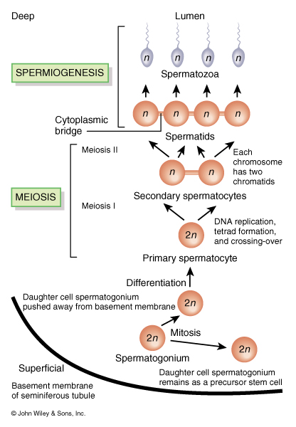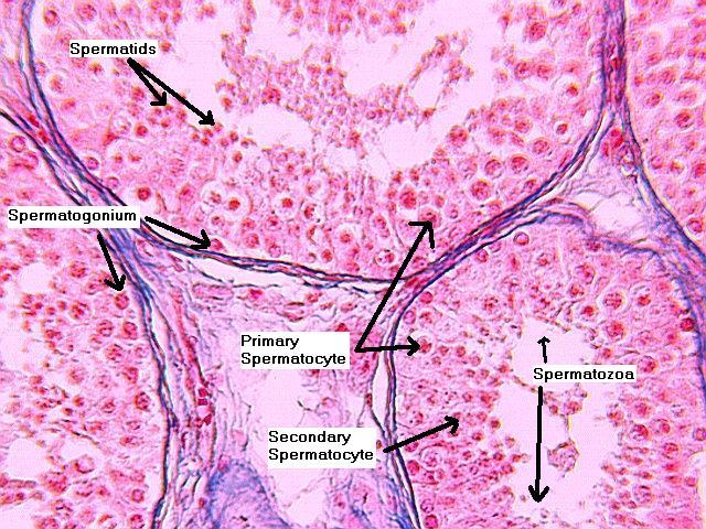 The testes are the male gonads, and consist of paired oval glands that sit outside the body within the scrotum. Lower temperature is required for normal spermatogenesis. They are surrounded by a dense white capsule called the tunica albuginea, and septa form 200-300 compartments called lobules. Each is filled with 2 or 3 seminiferous tubules where sperm are formed. Spermatogenesis is the formation of sperm from spermatogonia. Seminiferous tubules contain all stages of sperm development: spermatogonia, primary spermatocyte, secondary spermatocytes, spermatid and spermatozoa. The supporting cells are called Sertoli cells. Leydig cells in between tubules secrete testosterone.