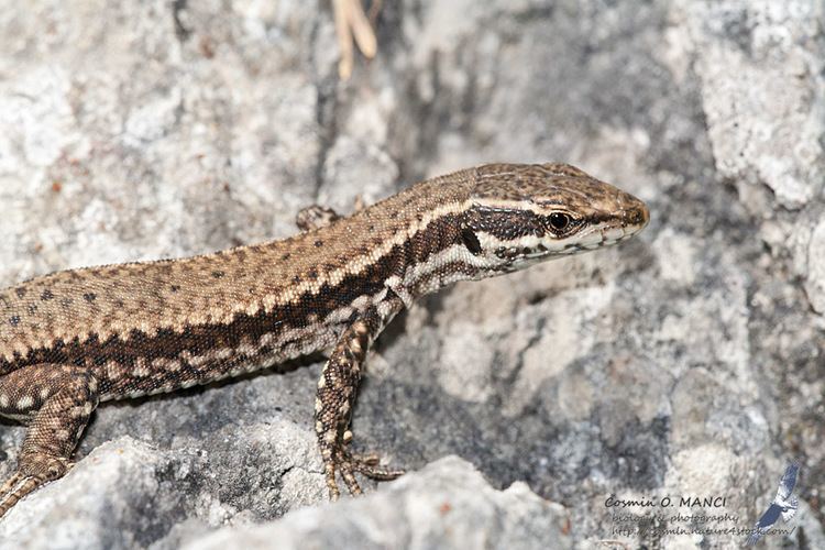 Lagartija pequeña, cuyo dorso dorso, de color gris ceniciento a pardo-verdoso, suele estar recorrido por cuatro líneas de un color crema, amarillento o verdoso.