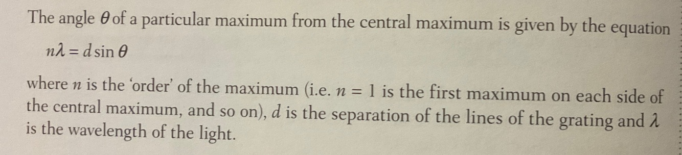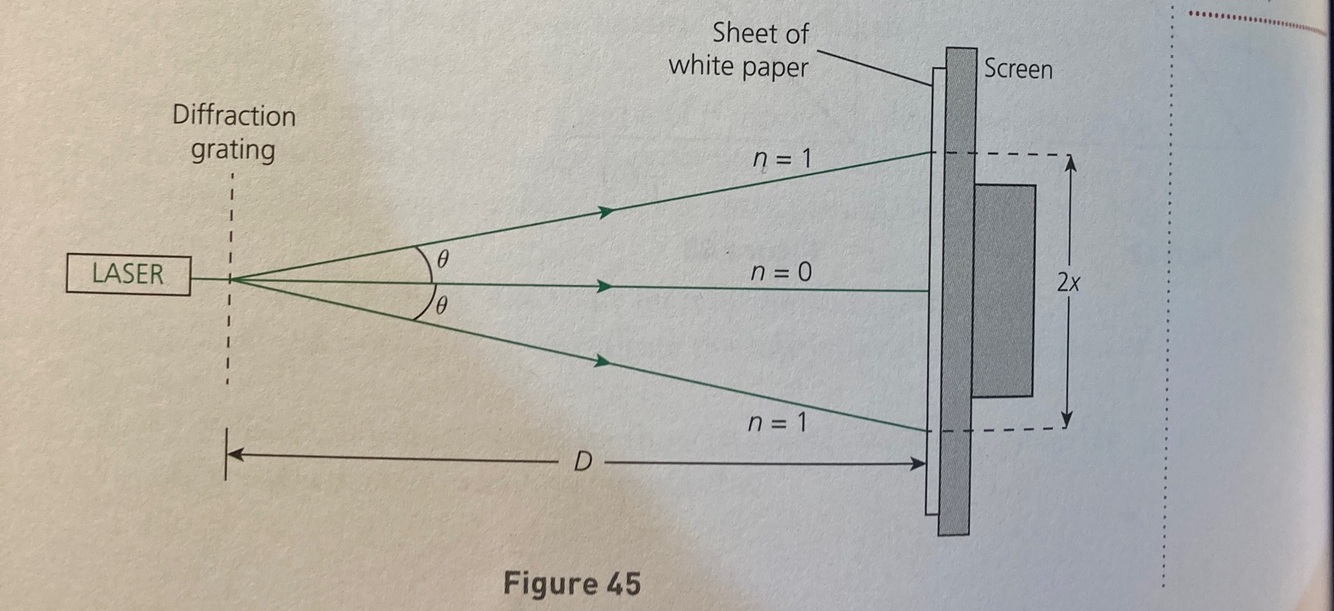 Adjust the distance D between the grating and the screen until a number of orders can be seen and sufficiently apart to be measured with a millimetre scale