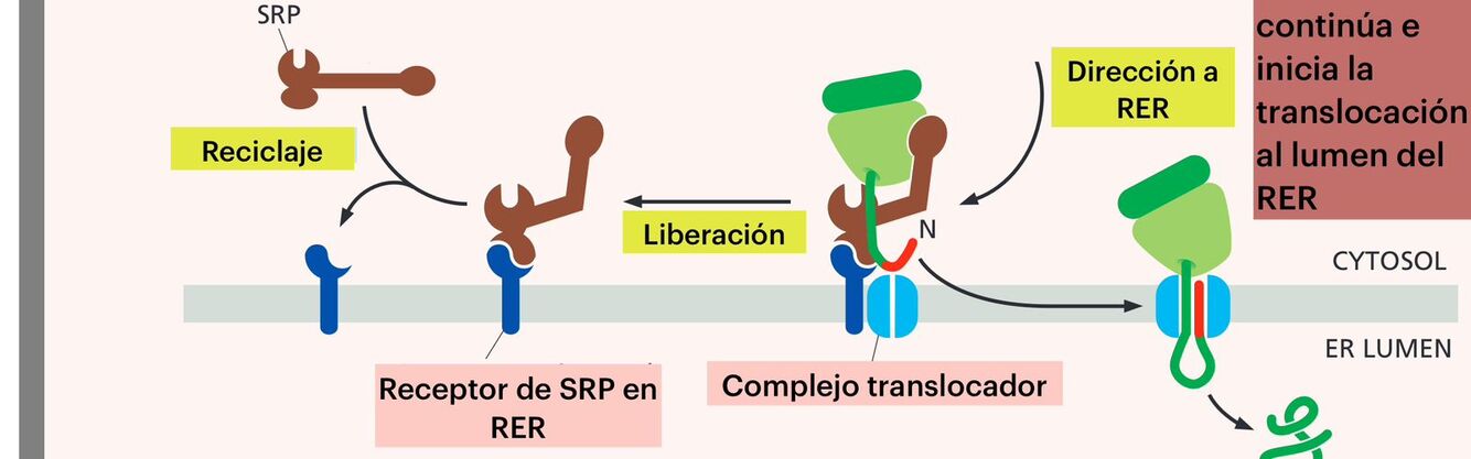 Al unirse el RER el ribosoma libera al SRP y reanuda la sintesis de la proteina la cual pasara por un poro hacia el lumen.