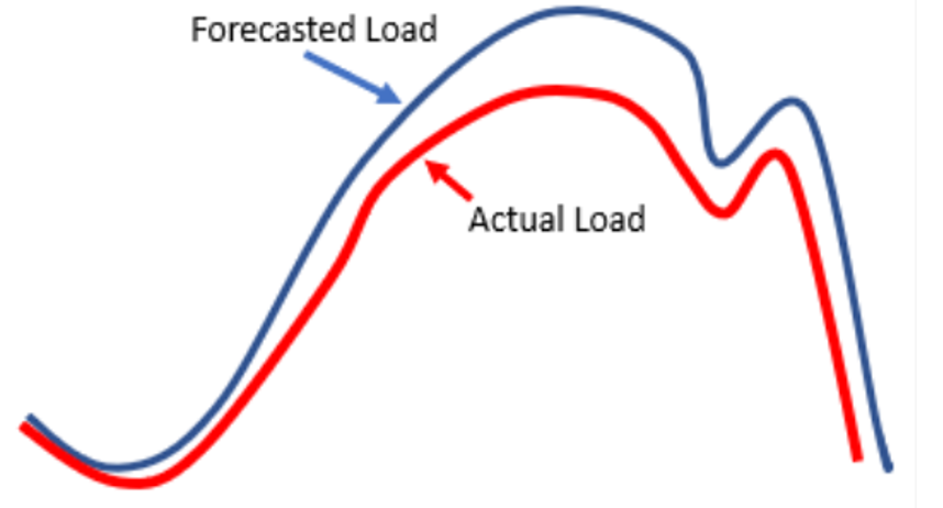During summer, the forecasted load is represented with the blue curve and the actual load is represented by the red curve. What would be a logical reason for the difference?