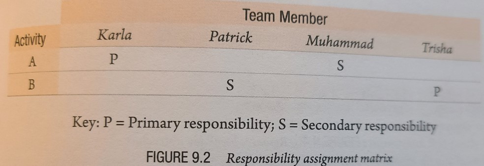 This chart cross-references team members with the activities or work packages they are to accomplish.