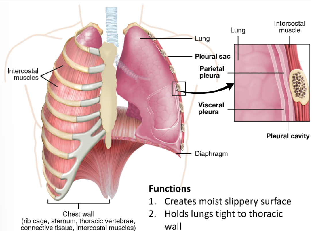 -one layer is connected to the outside surface of the lungs (visceral pleura) and the other to the inside surface of the thoracic cavity (parietal pleura)