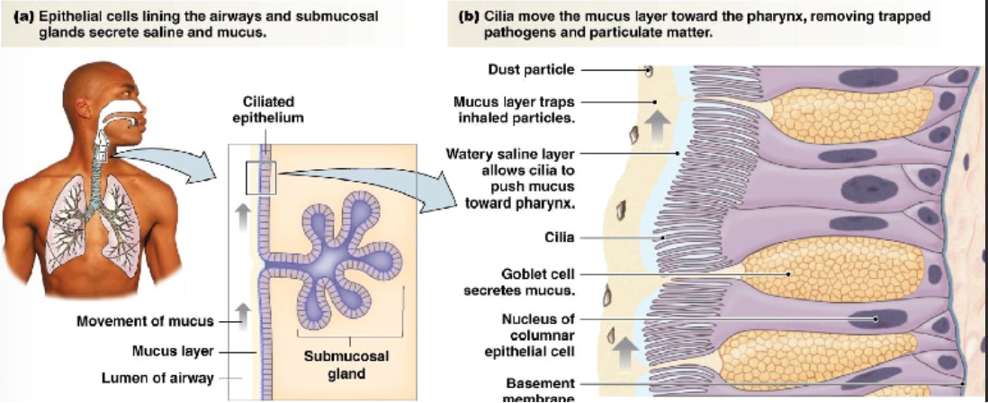 -the epithelial cells also contain cilia which push the mucus towards the pharynx (mucocilliary escalator)