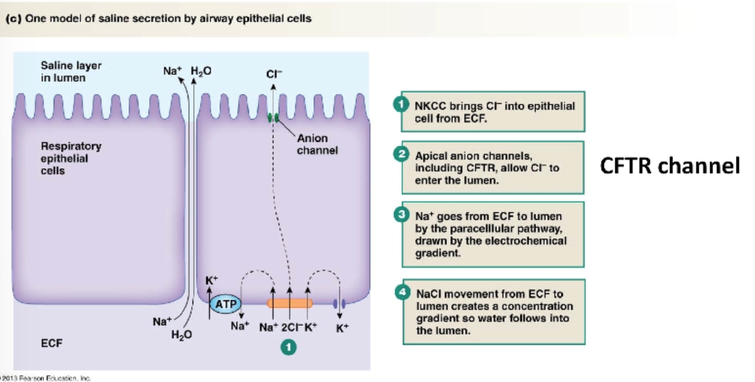 -saline is produced by the epithelial cells and overtop of the saline is a layer of mucus produced by goblet cells