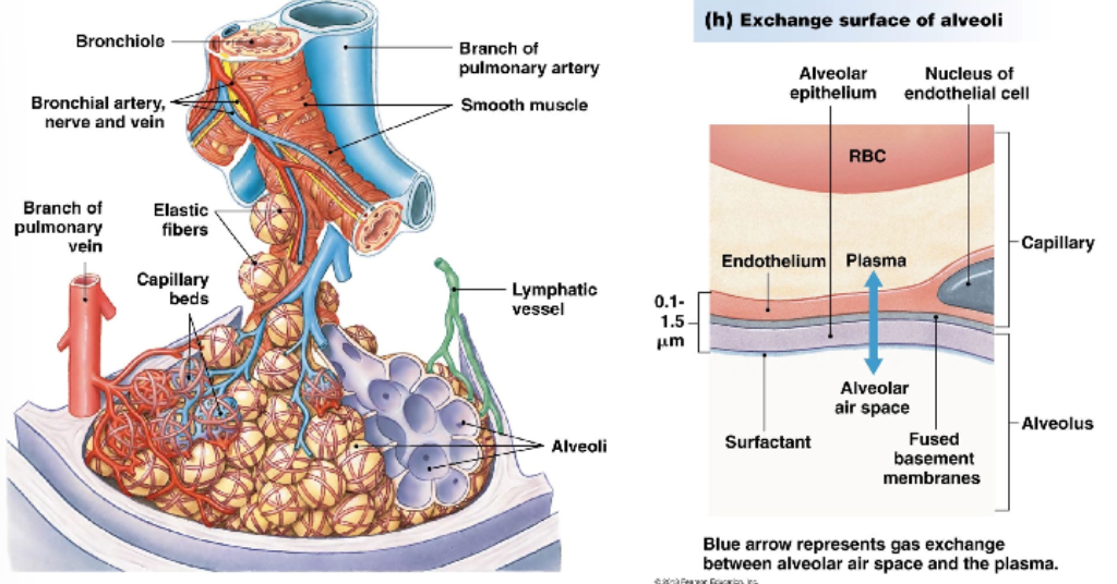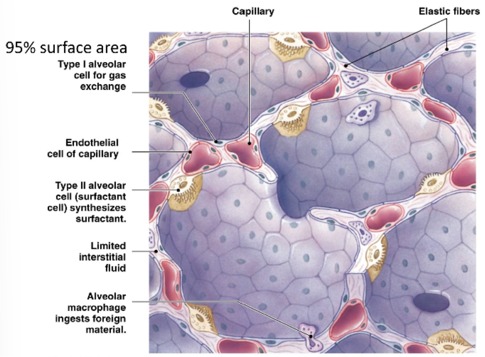 -heavily vascularized (80-90% alveoli covered) and huge surface area optimal for gas exchange