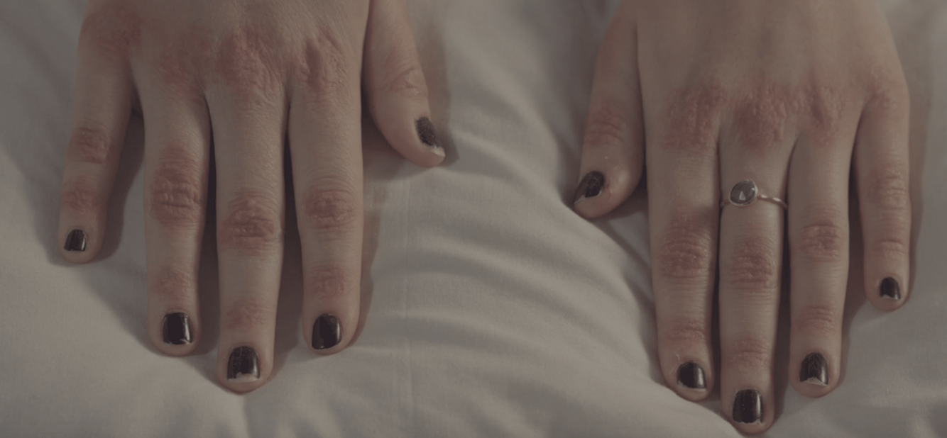 Characteristic discrete red areas overlying the knuckles in a patient with dermatomyositis. They may be photosensitive and itchy.