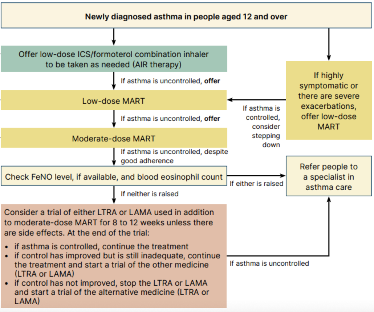 refer people to a specialist in asthma care when asthma is not controlled despite treatment with moderate-dose MART and