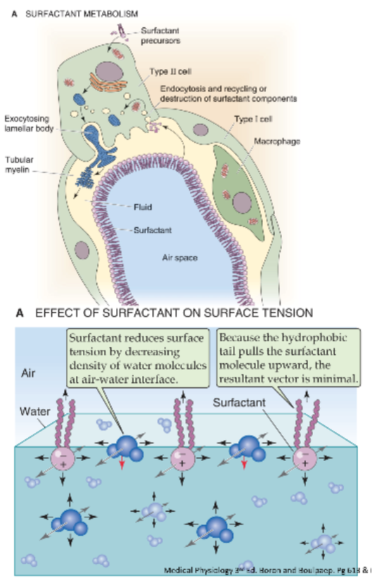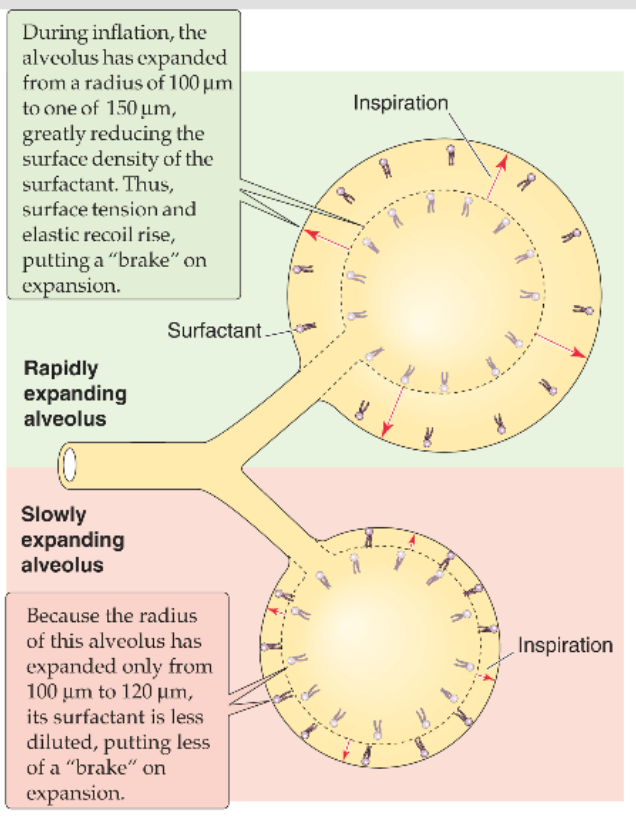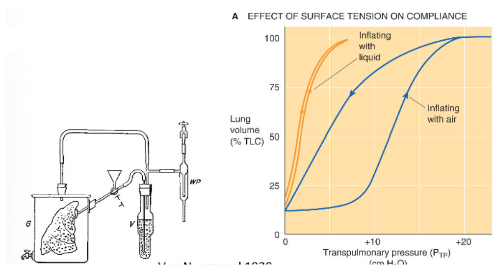 -an equally important determinant of compliance and a major determinant of the lungs elastic recoil is surface tension at the air water interface of the airways