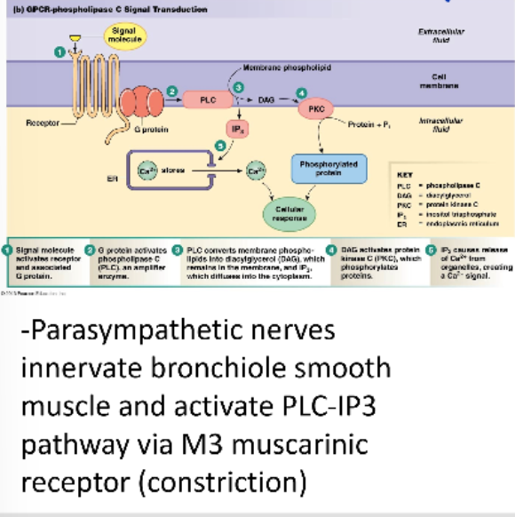 -parasympathetic nerves innervate bronchiole smooth muscle and activate PLC-IP3 pathway via M3 muscarinic receptor (constriction)