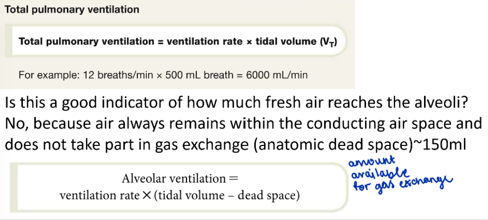 how do you calculate total pulmonary ventilation? why is this not a good indicator of the fresh air that reaches the alveoli?